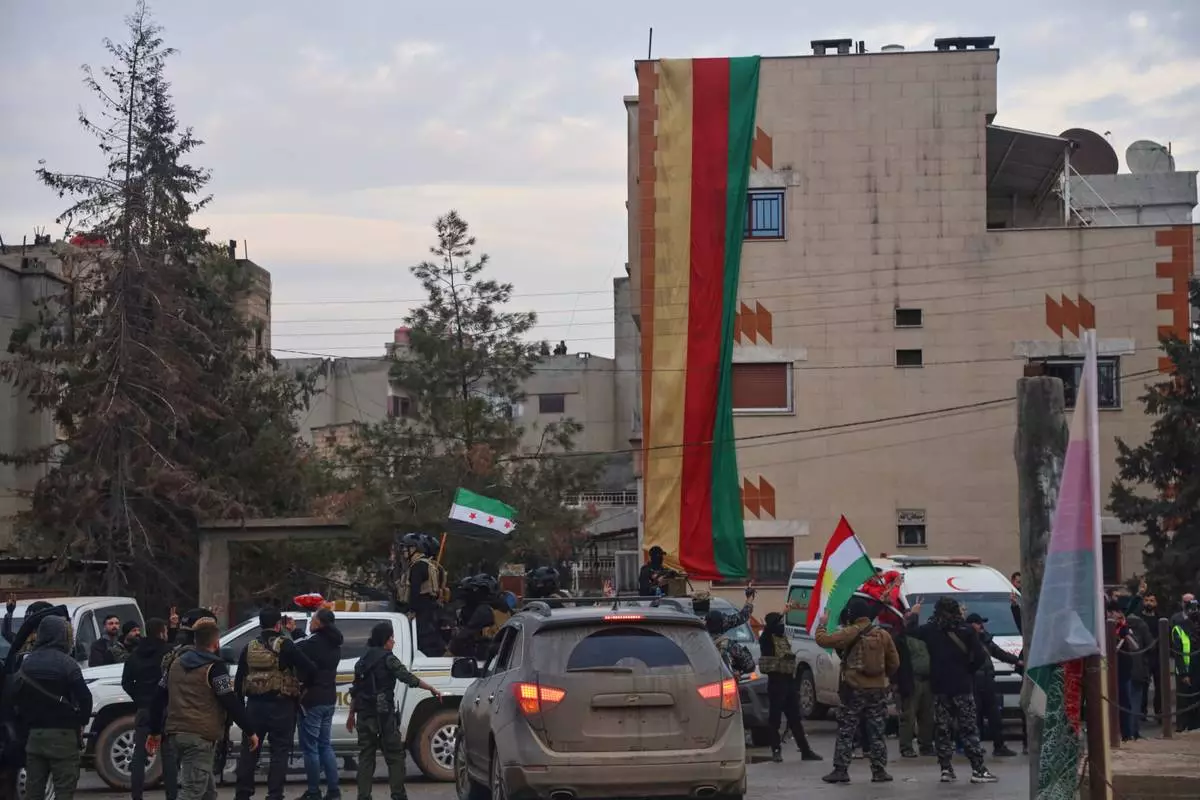 Kurdish-led Syrian Democratic Forces (SDF) combatants welcome the arrival of a convoy Syria's Interior Ministry security forces, deployed under an agreement aimed at stabilizing a ceasefire, in Qamishli, eastern Syria, Tuesday, Feb. 3, 2026. (AP Photo/Baderkhan Ahmad)