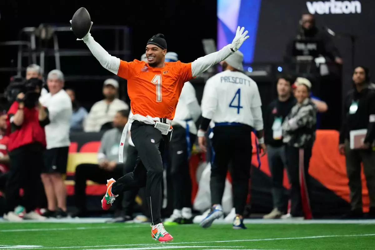 AFC wide receiver Ja'Marr Chase (1), of the Cincinnati Bengals, returns an interception for a touchdown against the NFC during the first half of the NFL Pro Bowl football game, Tuesday, Feb. 3, 2026, in San Francisco. (AP Photo/Godofredo A. Vásquez)