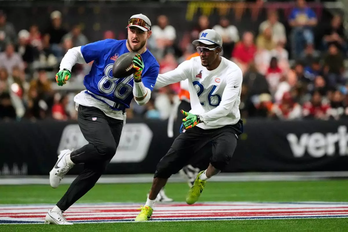 AFC tight end Dalton Kincaid (86), of the Buffalo Bills, runs with the ball while defended by NFC cornerback Nahshon Wright (26), of the Chicago Bears, during the first half of the NFL Pro Bowl football game, Tuesday, Feb. 3, 2026, in San Francisco. (AP Photo/Jeff Chiu)