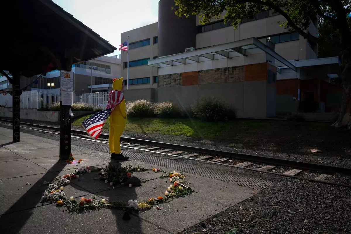 FILE - Jack Dickinson, dressed in a chicken costume, looks to other protesters outside a United States Immigration and Customs Enforcement (ICE) facility in Portland, Ore., Monday, Oct. 20, 2025. (AP Photo/Jenny Kane,File)