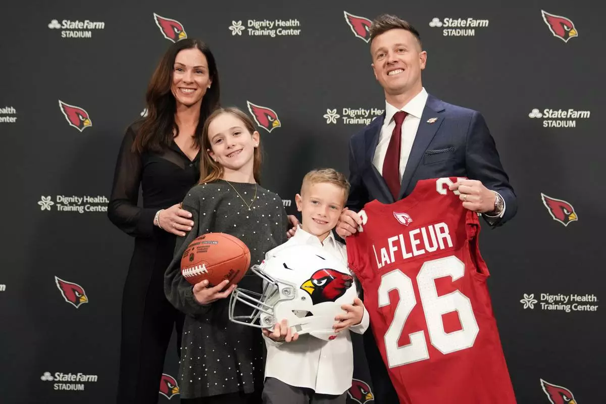 Arizona Cardinals new head coach Mike LaFleur poses with his family after after being introduced during an NFL football news conference, Tuesday, Feb. 3, 2026, in Tempe, Ariz. (AP Photo/Rick Scuteri)