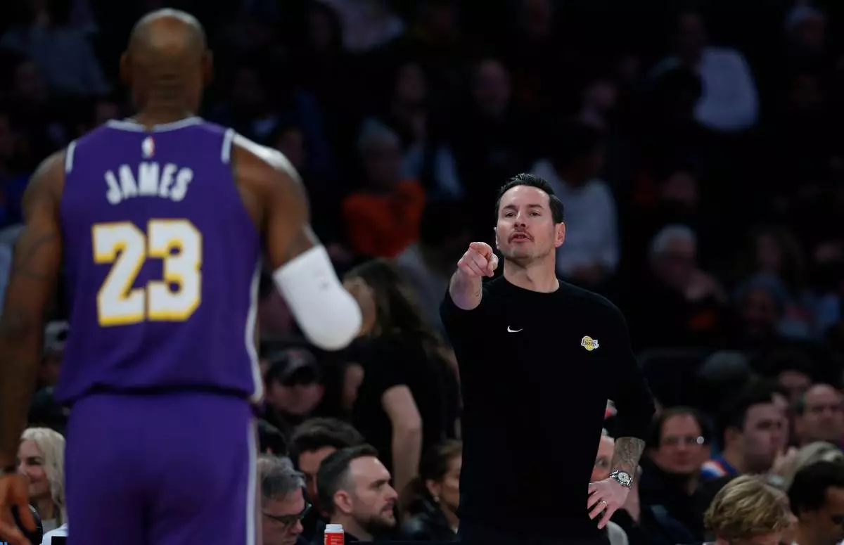 Los Angeles Lakers head coach JJ Redick, right, talks to forward LeBron James during the first half of an NBA basketball game against the New York Knicks Sunday, Feb. 1, 2026, in New York. (AP Photo/John Munson)