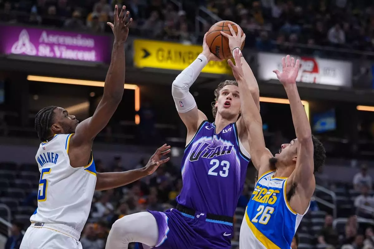 Utah Jazz forward Lauri Markkanen (23) shoots between Indiana Pacers forward Jarace Walker (5) and guard Ben Sheppard (26) during the second half of an NBA basketball game in Indianapolis, Tuesday, Feb. 3, 2026. (AP Photo/Michael Conroy)