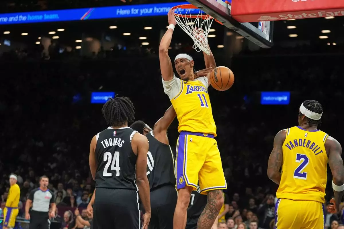 Los Angeles Lakers' Jaxson Hayes (11) dunks the ball in front of Brooklyn Nets' Cam Thomas (24) during the first half of an NBA basketball game Tuesday, Feb. 3, 2026, in New York. (AP Photo/Frank Franklin II)
