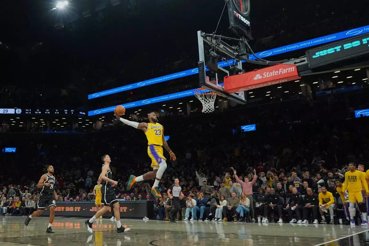 Brooklyn was coming off a 53-point loss in Detroit on Sunday and it appeared the Lakers might win by even more. They made 15 of their 18 shots (83.3%) in the first quarter in opening a 45-23 lead, then James scored while being fouled on their first shot of the second.