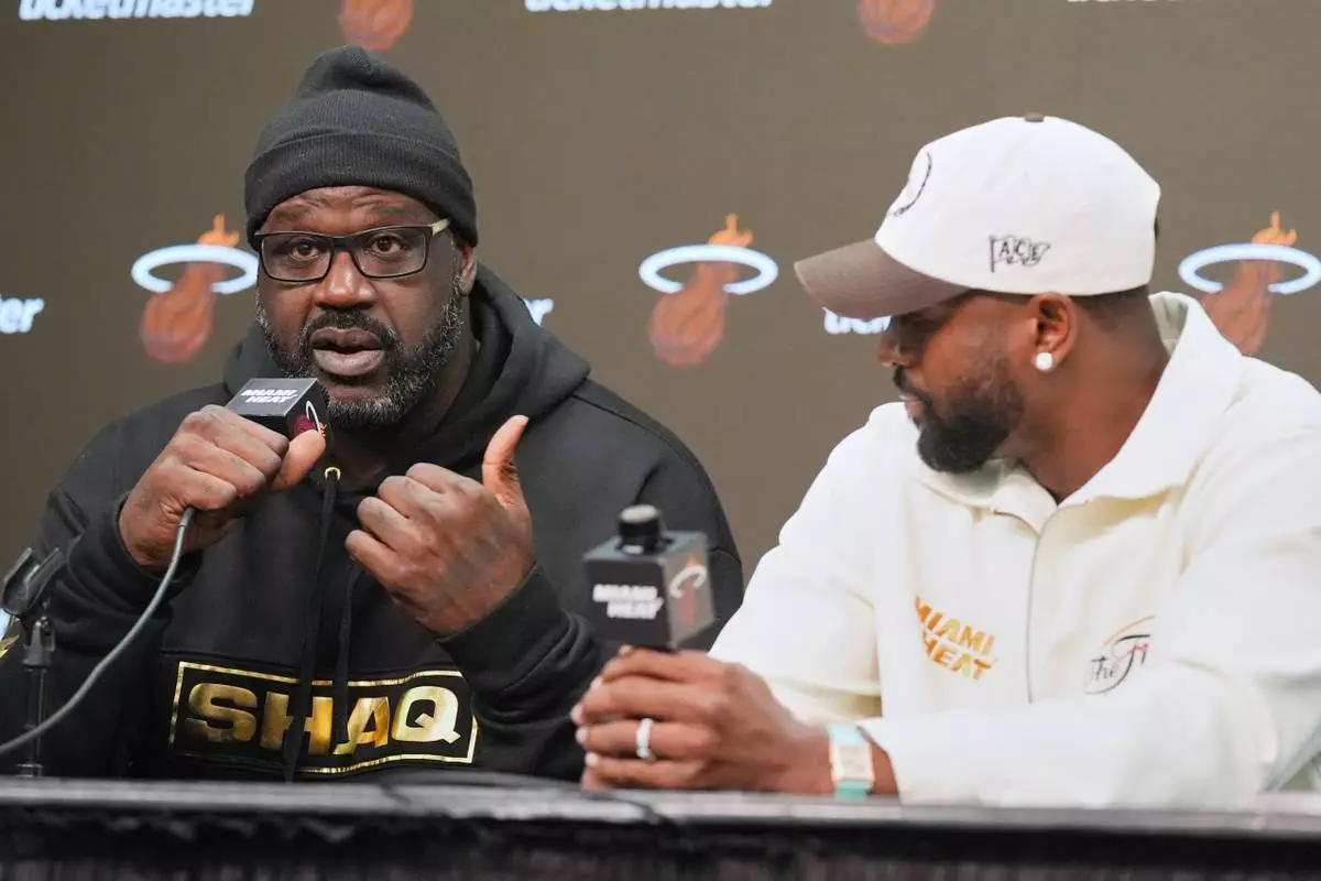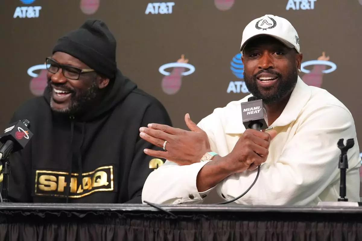 Former Miami Heat players Dwyane Wade, right and Shaquille O'Neal talk about their experience winning the NBA finals 20 years ago during a news conference Tuesday, Feb. 3, 2026, in Miami. (AP Photo/Marta Lavandier)