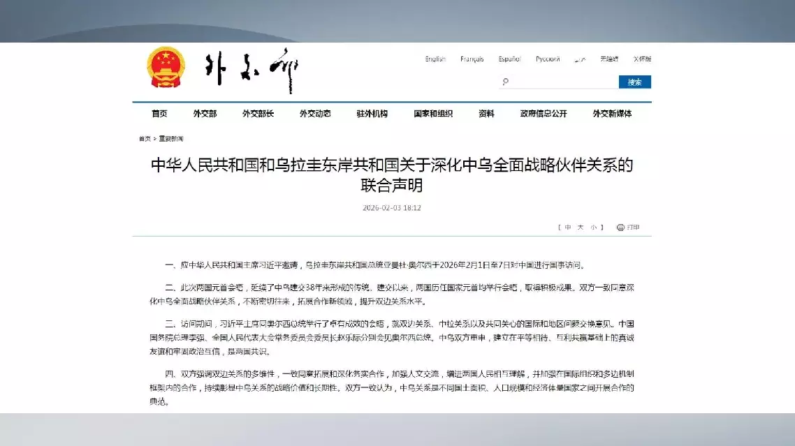 The statement said that the relationship between China and Uruguay serves as a model of cooperation between countries with different land areas, population sizes and economic volumes. China and Uruguay enjoy a long-standing friendly relationship, respecting each other's sovereignty and territorial integrity, and understanding and supporting each other's core interests and major concerns.