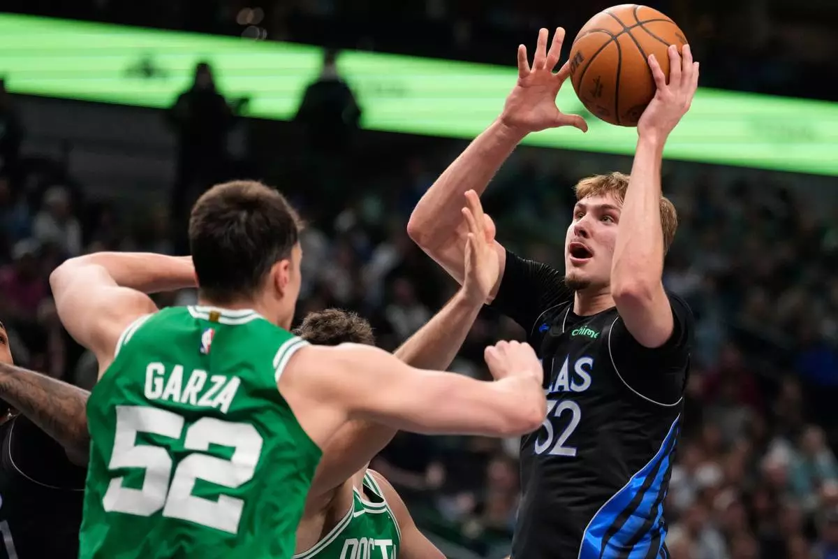 Dallas Mavericks' Cooper Flagg (32) takes a shot as Boston Celtics' Luka Garza (52) and Hugo Gonzalez, rear, defend in the first half of an NBA basketball game Tuesday, Feb. 3, 2026, in Dallas. (AP Photo/Tony Gutierrez)