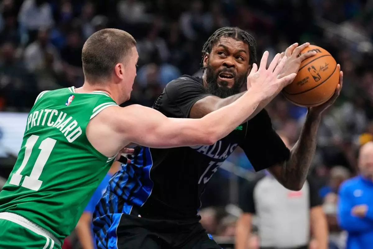 Dallas Mavericks forward Naji Marshall, right, looks for a shot as Boston Celtics' Payton Pritchard (11) defends in the first half of an NBA basketball game Tuesday, Feb. 3, 2026, in Dallas. (AP Photo/Tony Gutierrez)