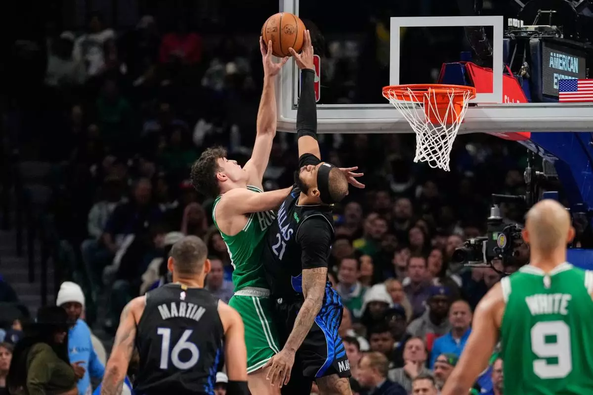 Boston Celtics guard Hugo Gonzalez, left, has his shot blocked b y Dallas Mavericks' Daniel Gafford (21) in the first half of an NBA basketball game Tuesday, Feb. 3, 2026, in Dallas. (AP Photo/Tony Gutierrez)