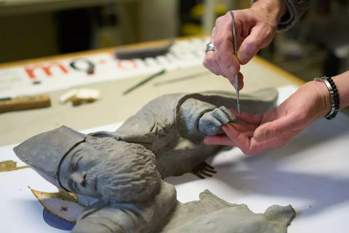 Massimiliano Trubbiani, an expert in tactile education for blind and visually impaired people, works to transform Titian's Pala Gozzi into bas-relief in a laboratory at the Omero Tactile Museum in Ancona, Italy, Friday, Jan. 16, 2026. (AP Photo/Alessandra Tarantino)