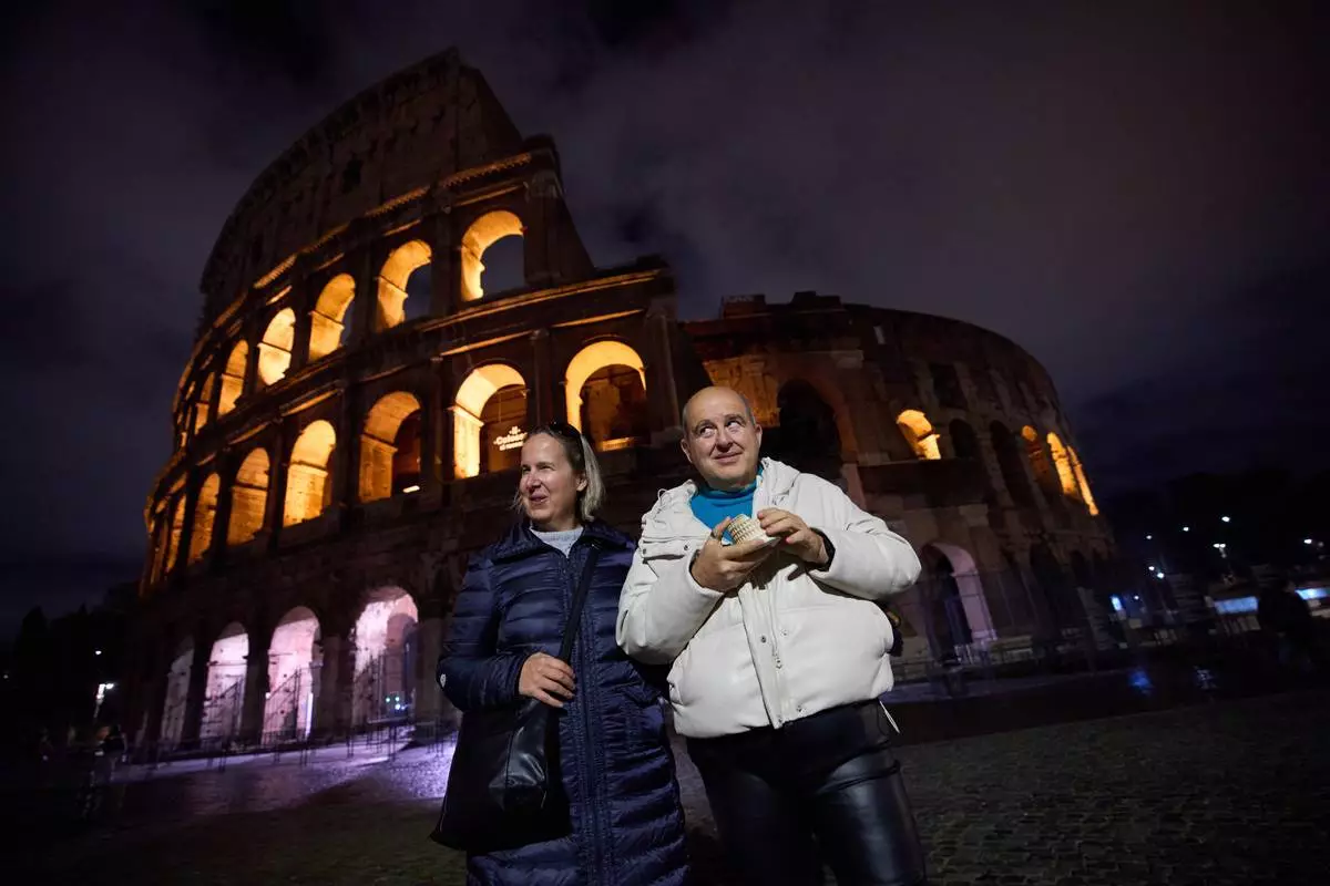Michela Marcato, left, who is blind, and her partially sighted partner Massimiliano Naccarato pose for a photo during a visit to the Colosseum in Rome, Wednesday, Dec. 17, 2025. (AP Photo/Alessandra Tarantino)
