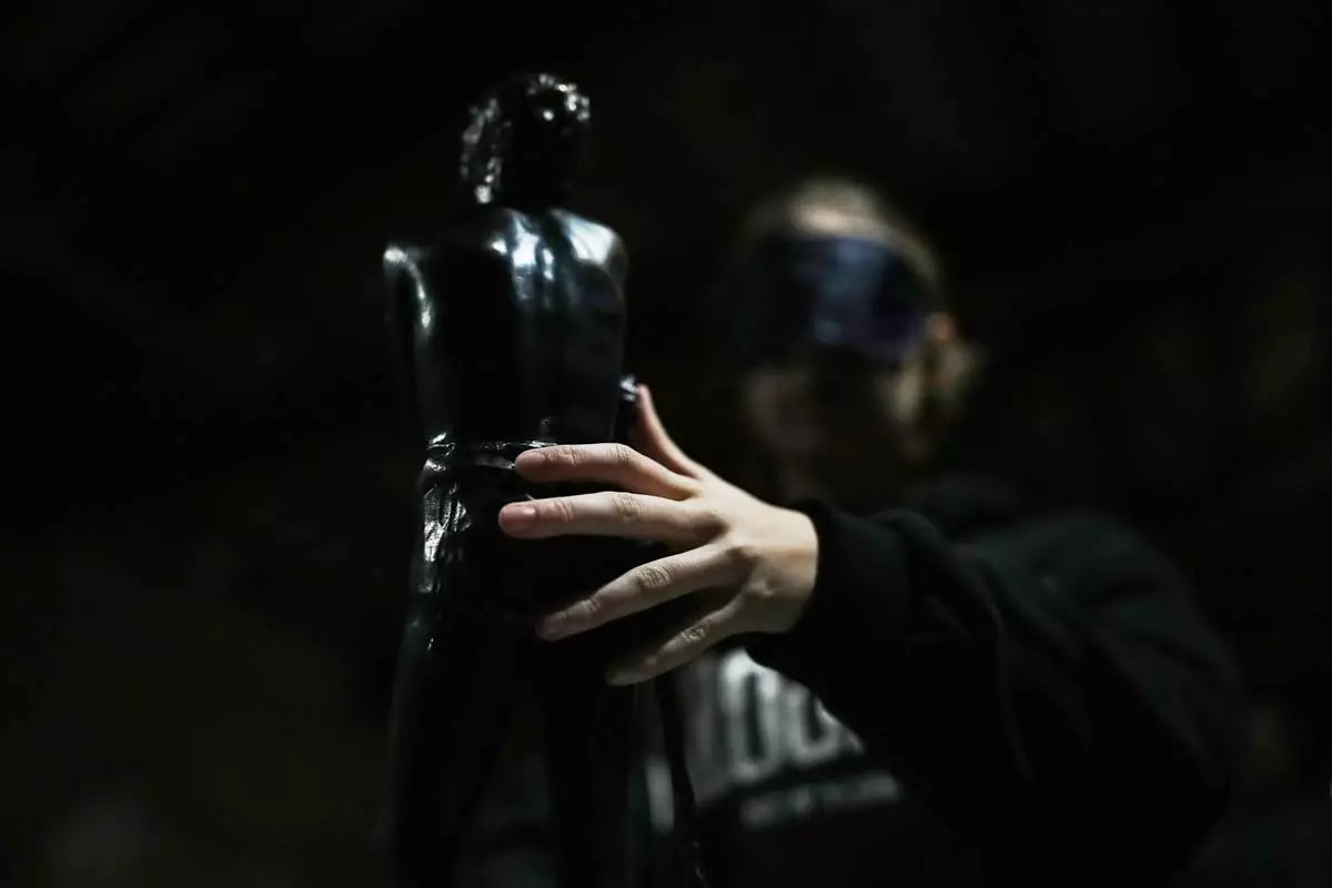 A blindfolded student of an art high school touches a piece in the pavilion of contemporary art during a project on tactile experience at the Omero Tactile Museum in Ancona, Italy, Friday, Jan. 16, 2026. (AP Photo/Alessandra Tarantino)