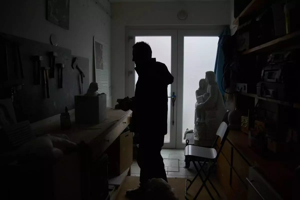 Powder covers the hammers of Felice Tagliaferri, a blind sculptor, in his studio in Cesena, Italy, Friday, Jan. 16, 2026. (AP Photo/Alessandra Tarantino)