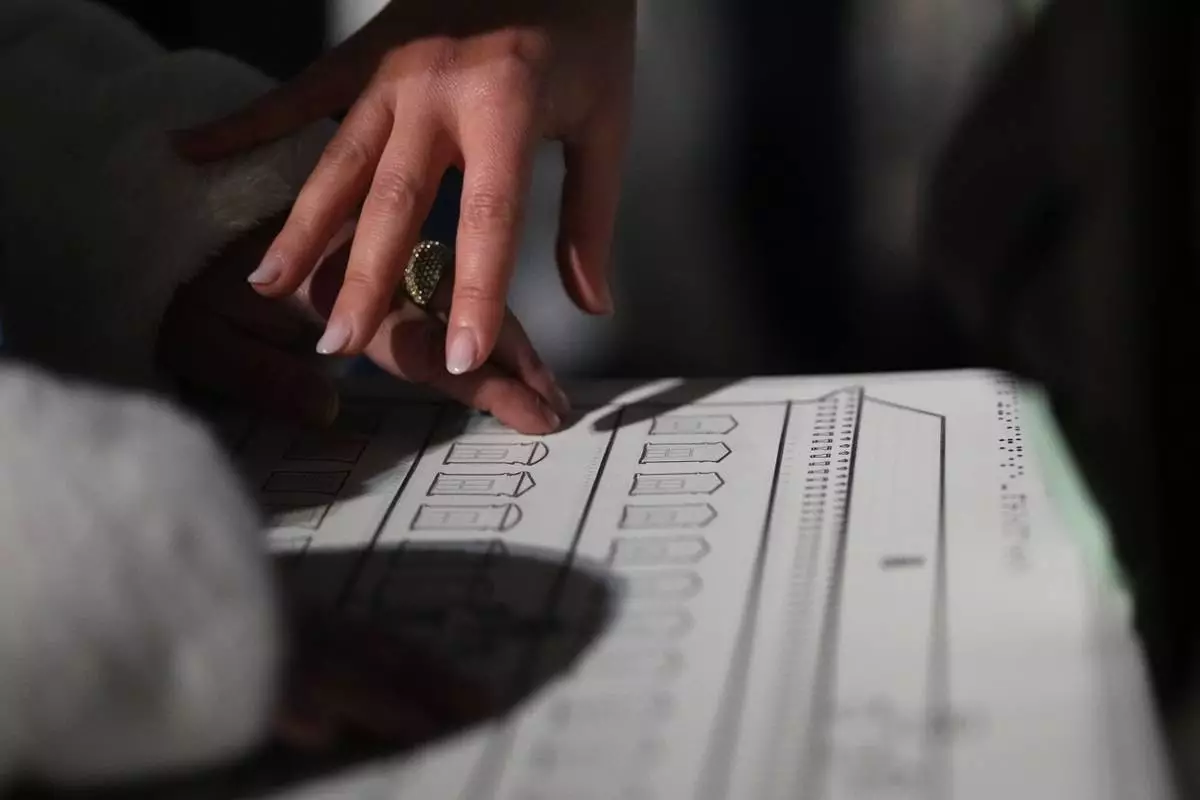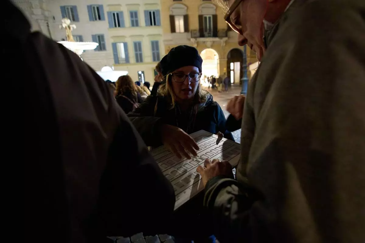 Francesca Inglese, who is blind, uses a tactile panel to experience the architecture of Palazzo Farnese during an inclusive art tour in downtown Rome, Nov. 29, 2025. (AP Photo/Alessandra Tarantino)