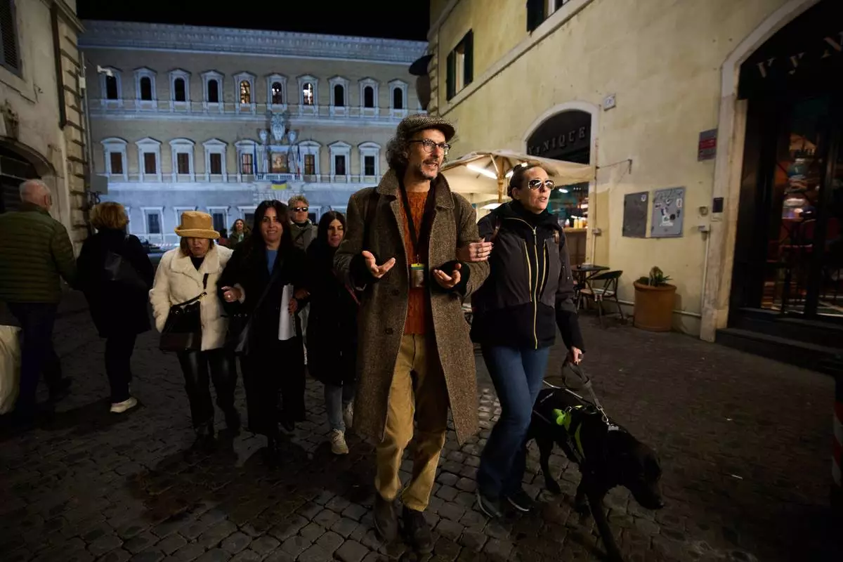 Giorgio Guardi, center, a guide from the Radici Association, walks with participants during one of their inclusive art tours in central Rome, Nov. 29, 2025. (AP Photo/Alessandra Tarantino)