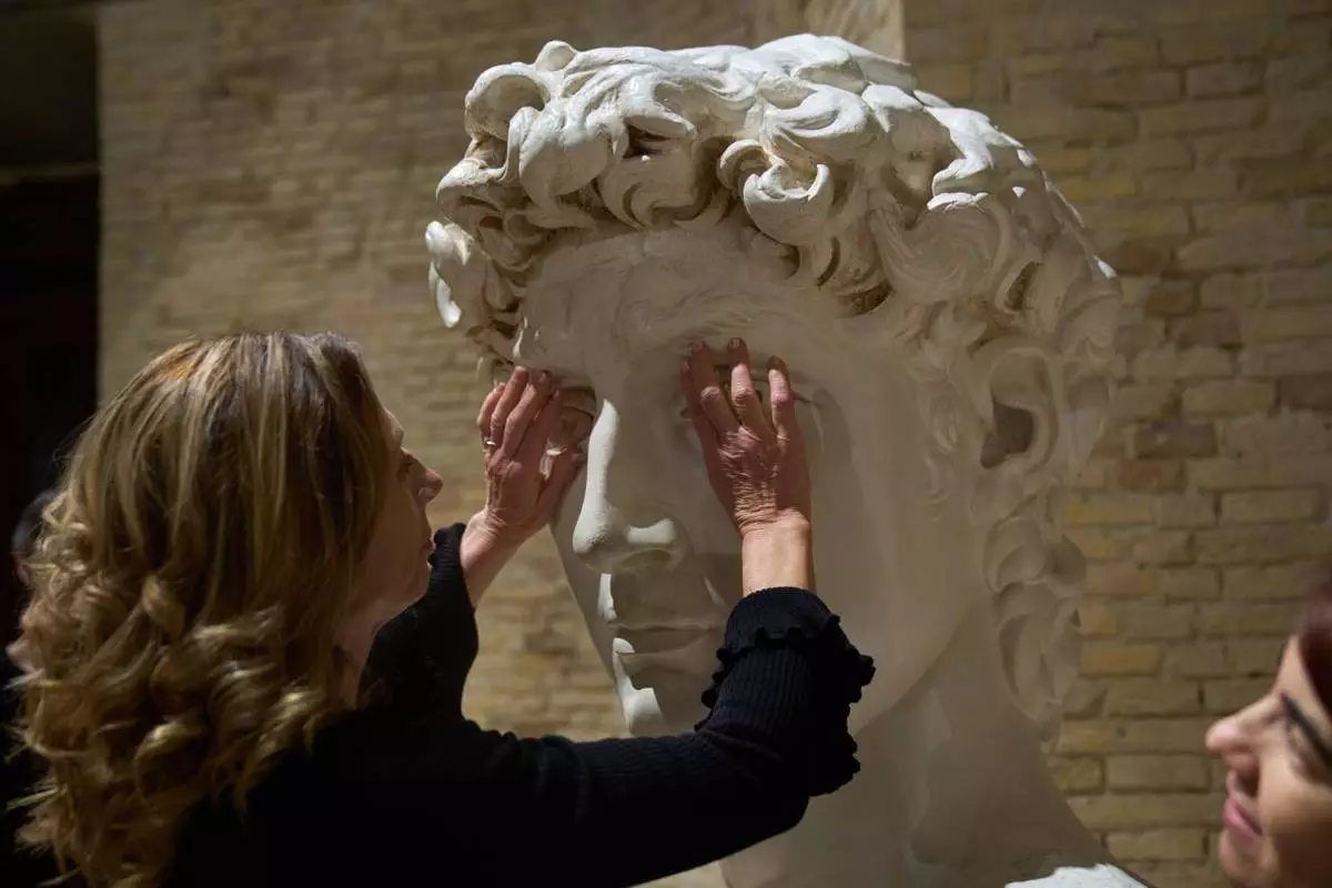 Stefania Terre, who is blind, touches a life-size reproduction of the head of Michelangelo's David during a visit to the Omero Tactile Museum in Ancona, Italy, Thursday, Jan. 15, 2026. (AP Photo/Alessandra Tarantino)