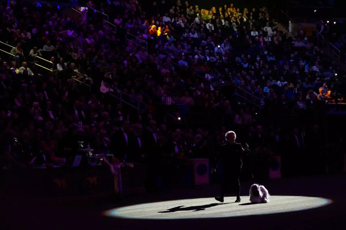 A light worn on the hands of Stefania Terre, who is blind, streaks across a life-size reproduction of Michelangelo's La Pieta as she touches the sculpture while posing for a long-exposure photograph at the Omero Tactile Museum in Ancona, Italy, Thursday, Jan. 15, 2026. (AP Photo/Alessandra Tarantino)