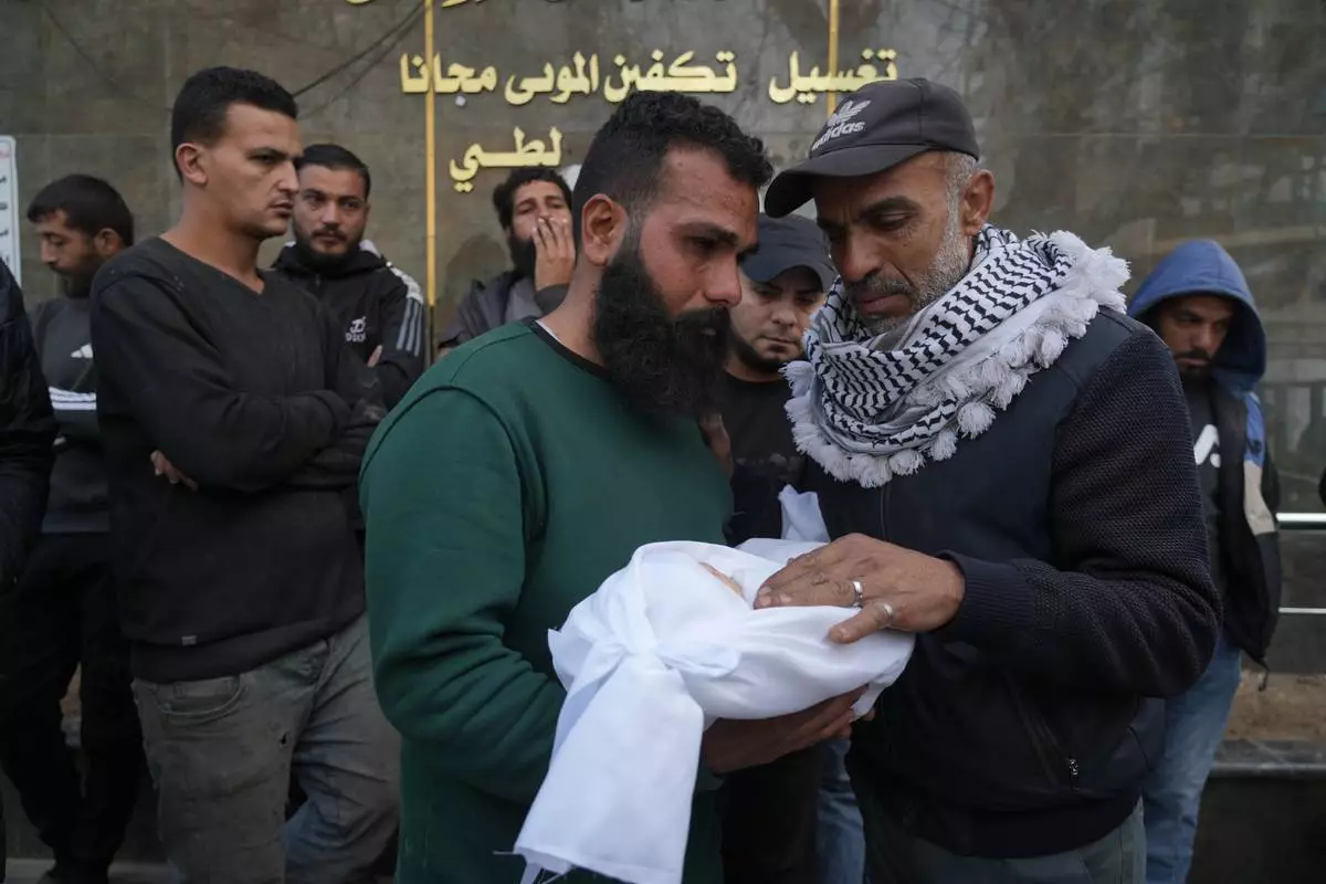 Palestinian Raed al-Khabba carries his 3-month-old daughter Mira al-Khabbaz, who was killed in an Israeli military strike, at Shifa Hospital in Gaza City, Wednesday, Feb. 4, 2026. (AP Photo/Jehad Alshrafi)