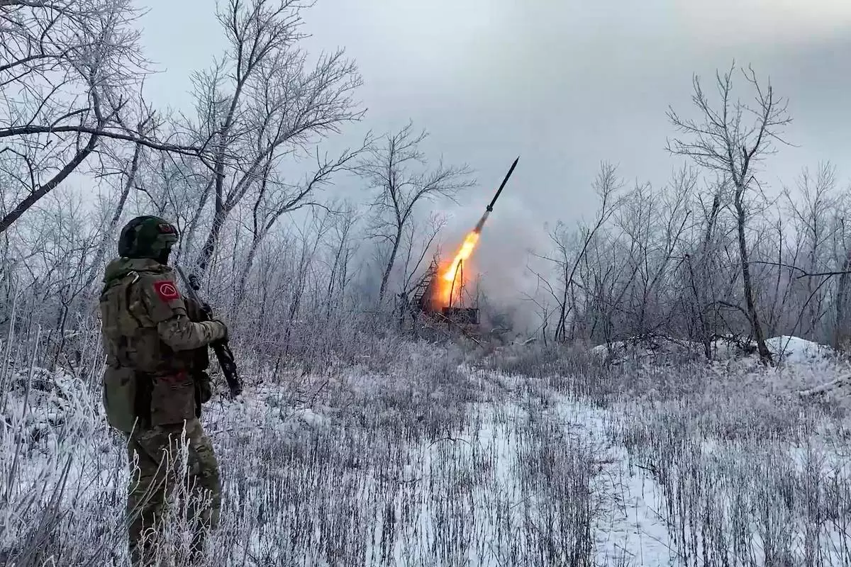 In this image made from video provided by Russian Defense Ministry Press Service on Wednesday, Feb. 4, 2026, Russian Multiple rocket launcher TOS-1A fires towards Ukrainian positions on an undisclosed location in Ukraine. (Russian Defense Ministry Press Service via AP)
