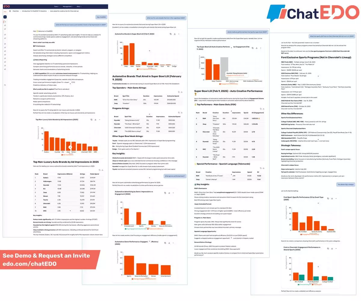 Rather than relying on generic AI platforms, ChatEDO leverages EDO’s decade of experience in Vertical AI, combining 10+ years of cross-platform outcomes data, trillions of impressions, hundreds of millions of airings, and syndicated benchmarks across industries. The result is an agentic system grounded in real, predictive consumer behavior, capable of turning immediate signals and historical benchmarks into actionable guidance.