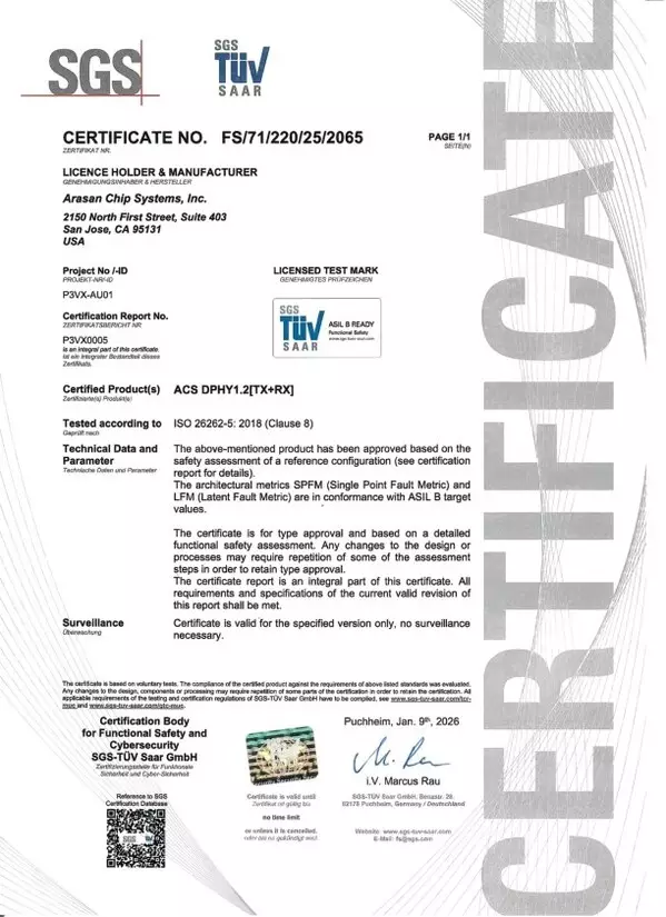 SAN JOSE, Calif., Feb. 4, 2026 /PRNewswire/ -- Arasan Chip Systems, the industry's first provider of IP for the MIPI standards today announced that its 2'nd generation ultra low power MIPI® D-PHY IP has achieved ISO 26262 functional safety certification. Arasan has been an executive member of the MIPI Association since 2005 and offers the broadest MIPI IP portfolio. The ISO 26262 certified MIPI D-PHY IP is available for immediately licensing on foundry nodes from 40nm to 4nm. Additional safety collateral and technical details are available to qualified customers upon request under NDA.