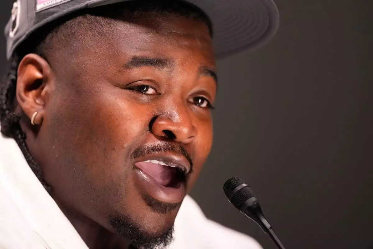 Seattle Seahawks defensive tackle Jarran Reed speaks during the NFL Super Bowl Opening Night, Monday, Feb. 2, 2026, in San Jose, Calif., ahead of the Super Bowl 60 football game between the Seattle Seahawks and the New England Patriots. (AP Photo/Charlie Riedel)