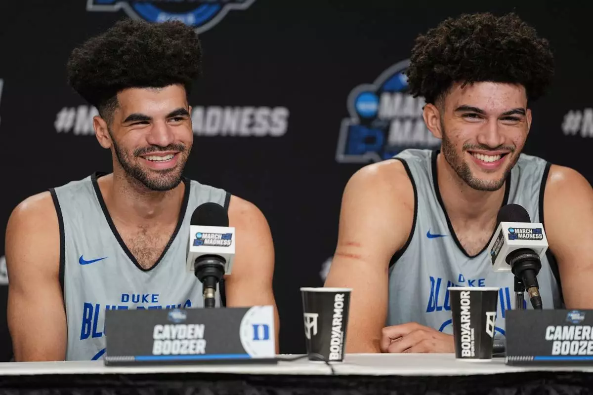Duke guard Cayden Boozer, left, and Duke forward Cameron Boozer, right, share a laugh during a press conference ahead of a game against UConn in the Elite Eight of the NCAA college basketball tournament Saturday, March 28, 2026, in Washington. (AP Photo/Abbie Parr)