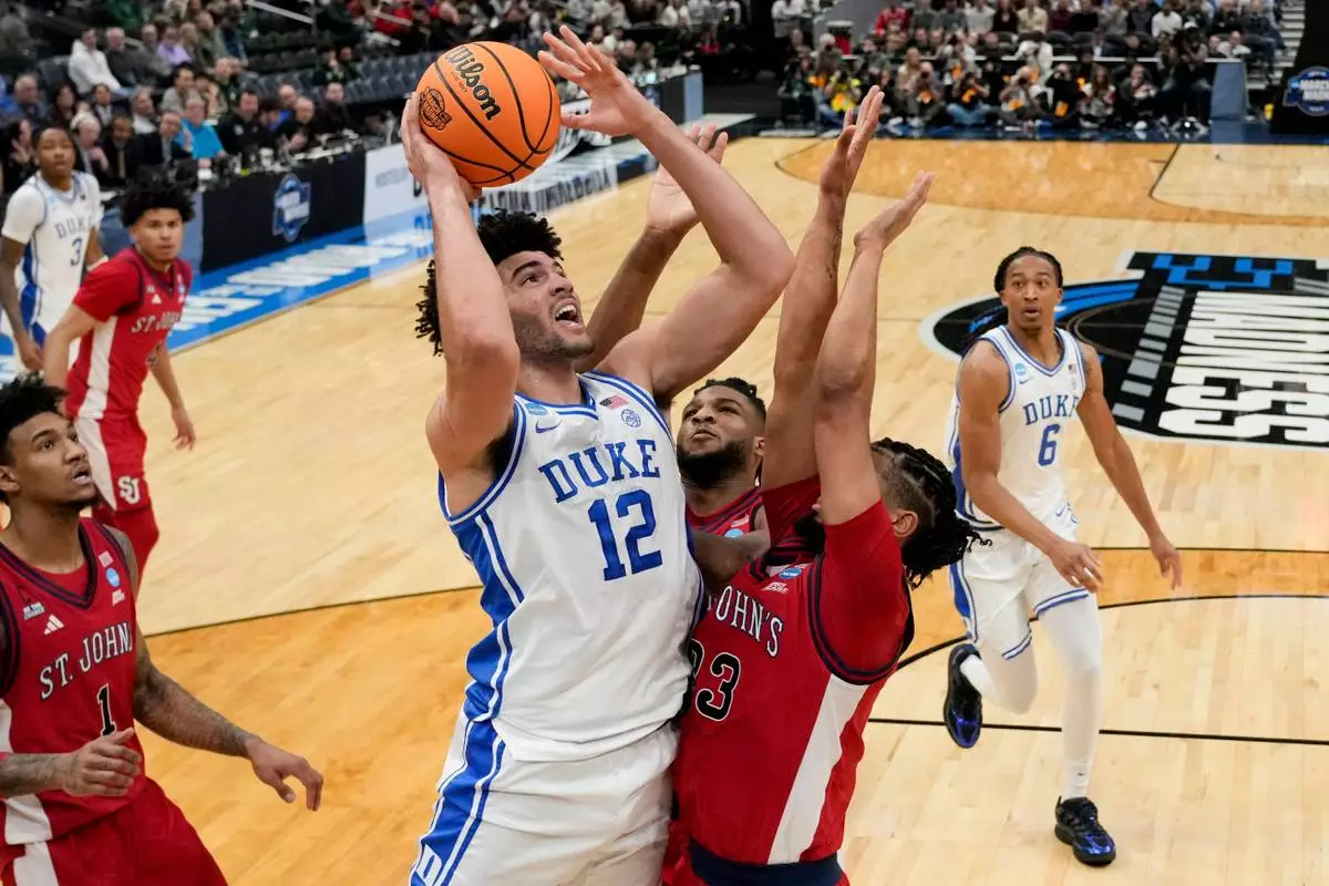 Duke forward Cameron Boozer (12) shoots over St. John's forward Bryce Hopkins (23) during the first half in the Sweet 16 of the NCAA college basketball tournament, Friday, March 27, 2026, in Washington. (AP Photo/Stephanie Scarbrough)