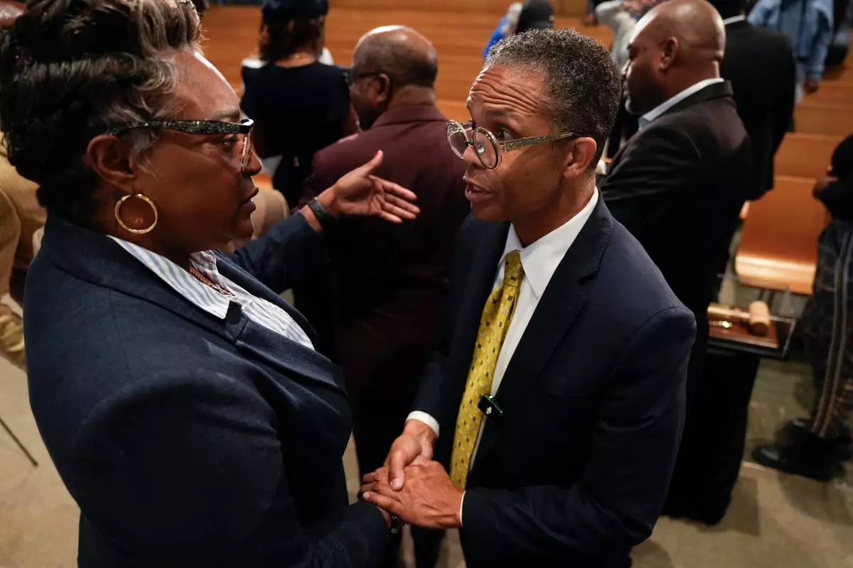 Former Illinois Rep. Jesse Jackson Jr., right, speaks to Knitasha Washington during an event where he was endorsed by the Southland Minister Alliance as a candidate for his old congressional seat after more than a decade out of office, Oct. 15, 2025, at Victory Christian International Ministries in Park Forest, Ill. (AP Photo/Erin Hooley)
