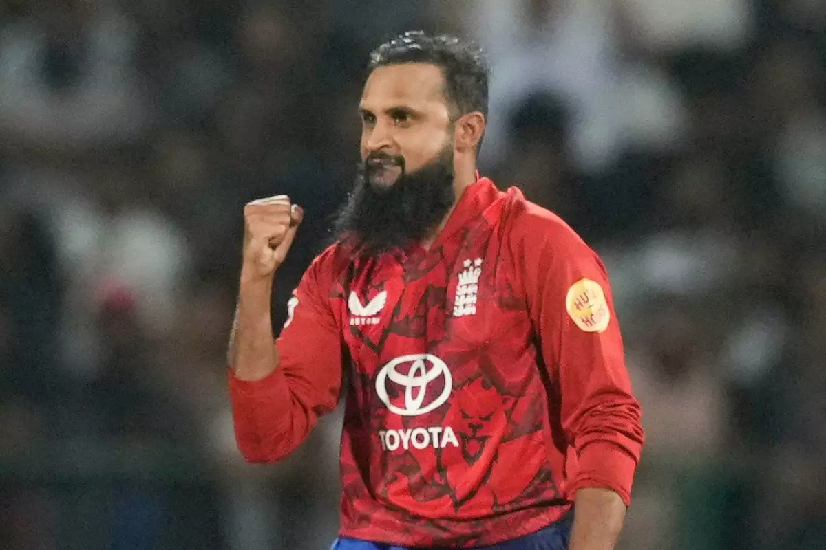England's Adil Rashid celebrates the wicket of Sri Lanka's Dhananjaya de Silva during the first T20 cricket match between England and Sri Lanka in Pallekele, Sri Lanka, Friday, Jan, 30. 2026. (AP Photo/Eranga Jayawardena)