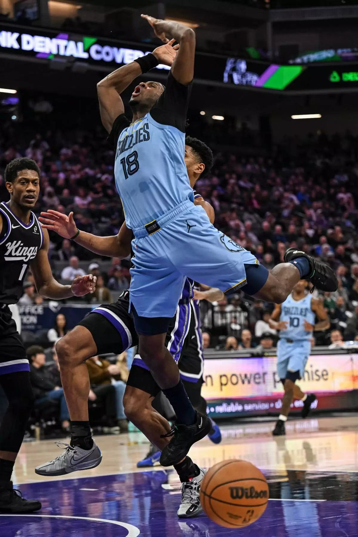 Memphis Grizzlies forward Olivier-Maxence Prosper (18) is fouled by Sacramento Kings center Dylan Cardwell during the first half of an NBA basketball game, Wednesday, Feb. 4, 2026, in Sacramento, Calif. (AP Photo/Justine Willard)