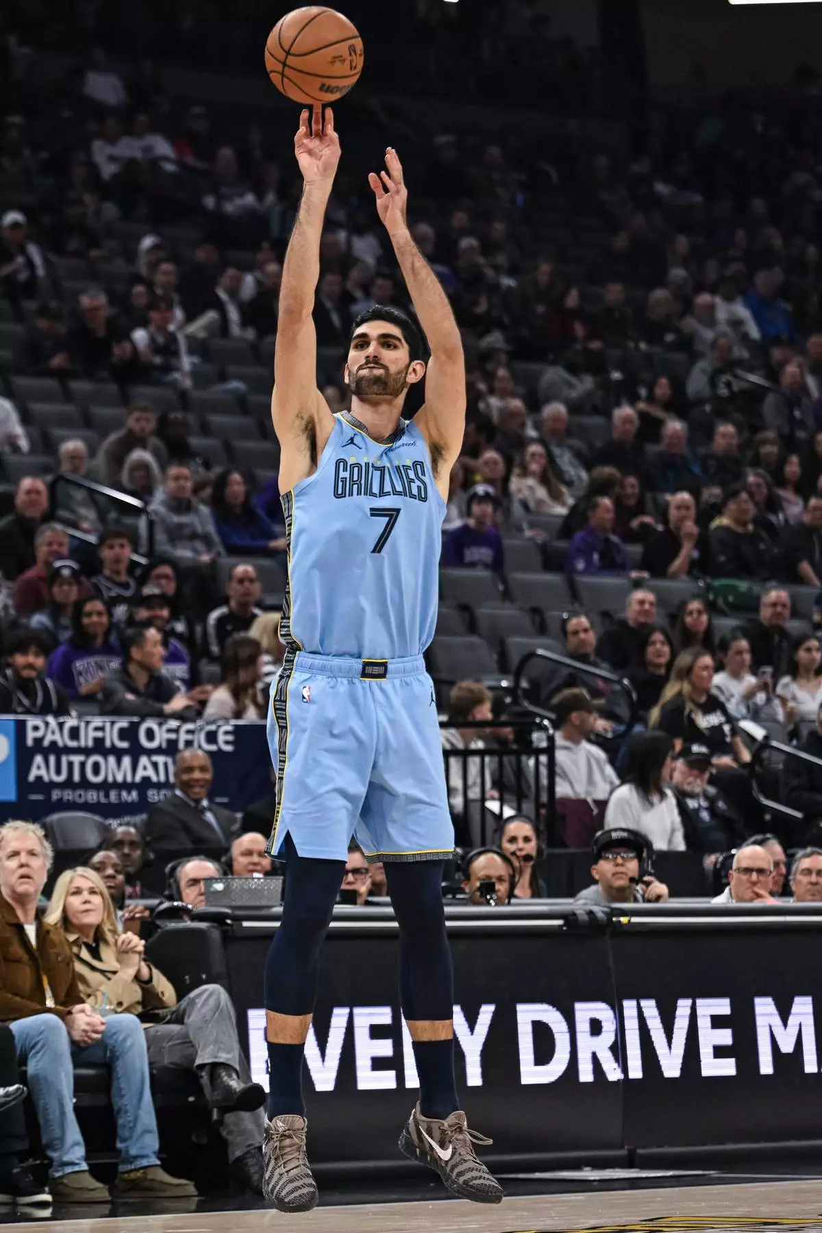 Memphis Grizzlies forward Santi Aldama (7) shoots a three point basket during the first half of an NBA basketball game against the Sacramento Kings, Wednesday, Feb. 4, 2026, in Sacramento, Calif. (AP Photo/Justine Willard)