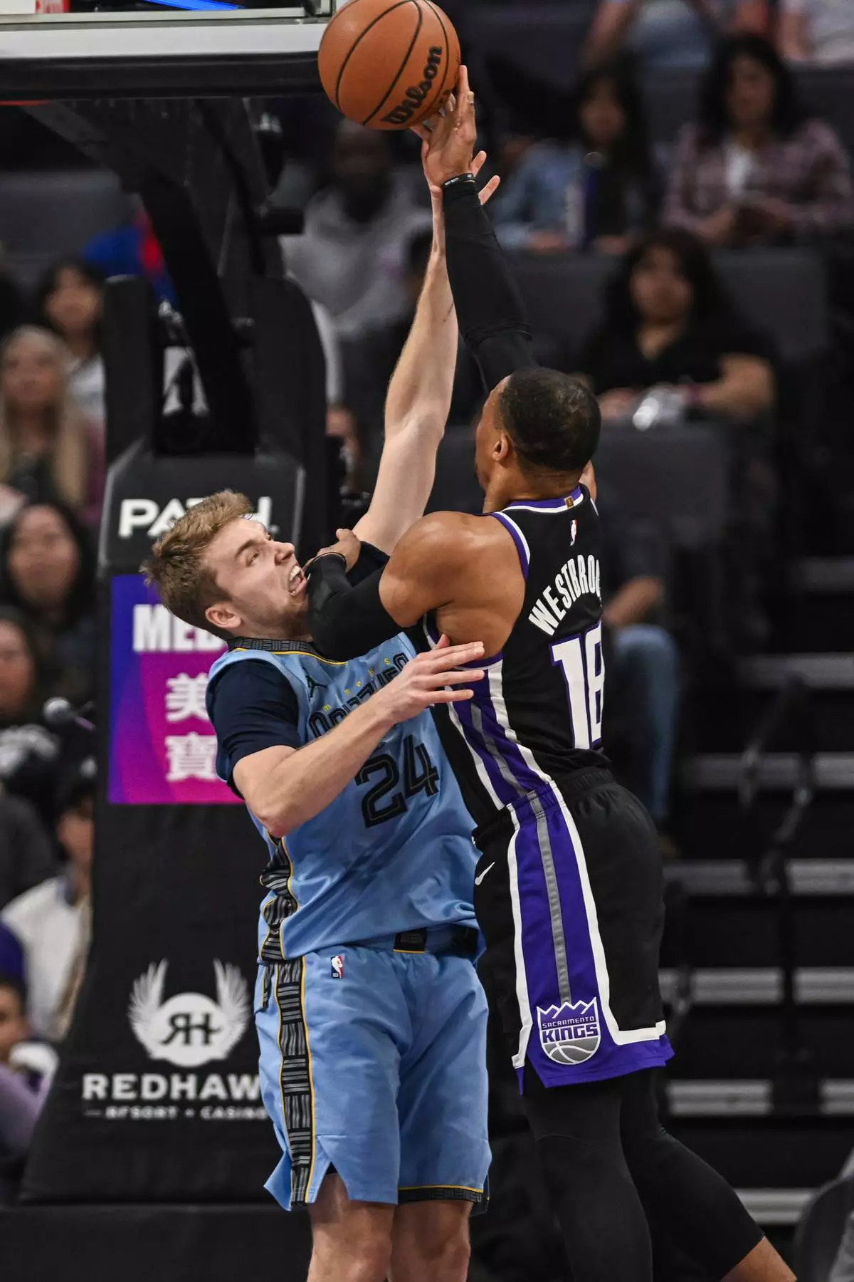 Sacramento Kings guard Russell Westbrook (18) shoots over Memphis Grizzlies guard Cam Spencer (24) during the first half of an NBA basketball game, Wednesday, Feb. 4, 2026, in Sacramento, Calif. (AP Photo/Justine Willard)