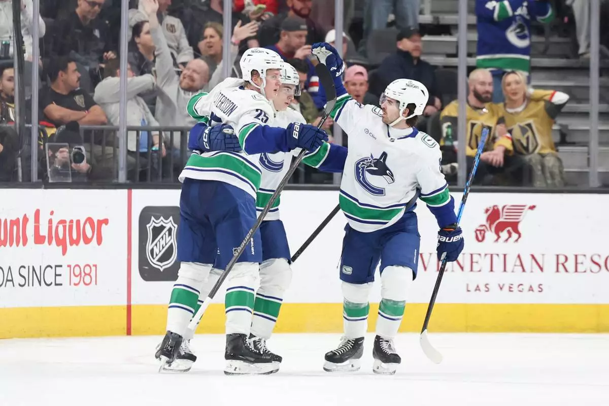Vancouver Canucks defenseman Elias Pettersson (25), left wing Liam Ohgren (92), and right wing Conor Garland (8) celebrate after Pettersson's goal against the Vegas Golden Knights during the second period of an NHL hockey game Wednesday, Feb. 4, 2026, in Las Vegas. (AP Photo/Ian Maule)