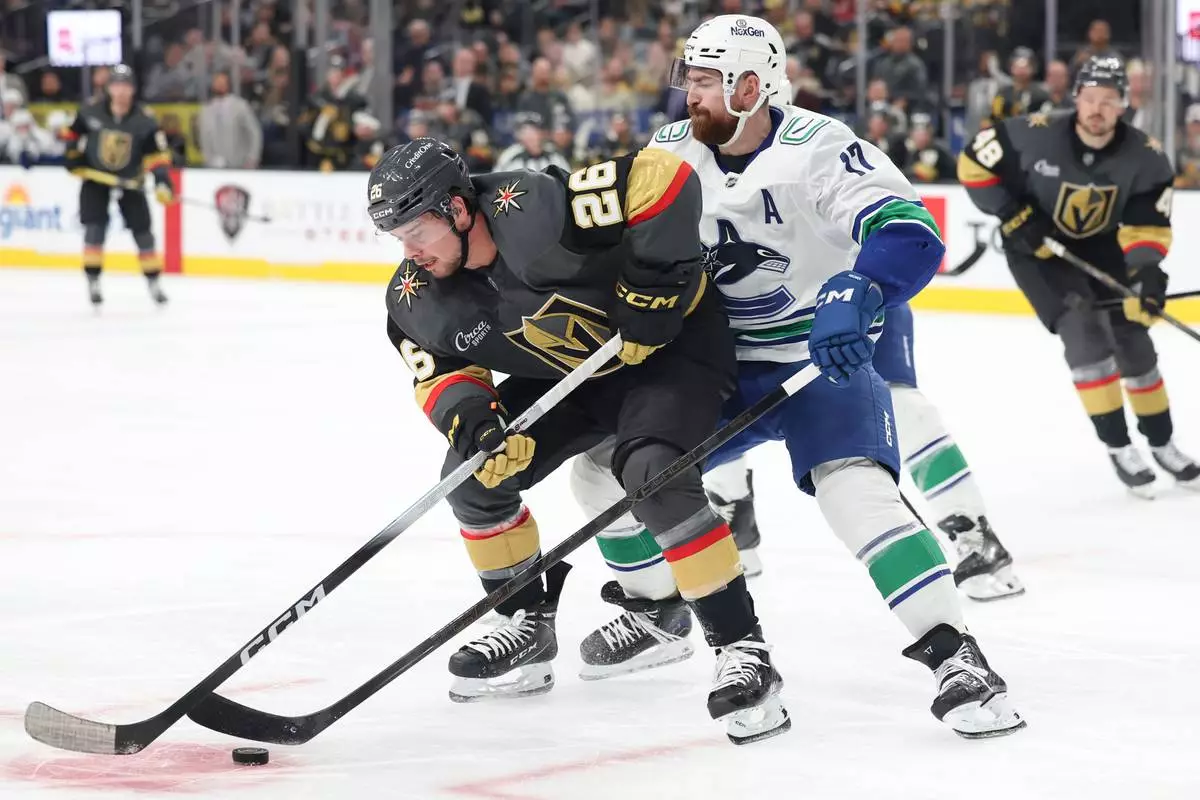 Vegas Golden Knights right wing Alexander Holtz (26) skates against Vancouver Canucks defenseman Filip Hronek (17) during the second period of an NHL hockey game Wednesday, Feb. 4, 2026, in Las Vegas. (AP Photo/Ian Maule)