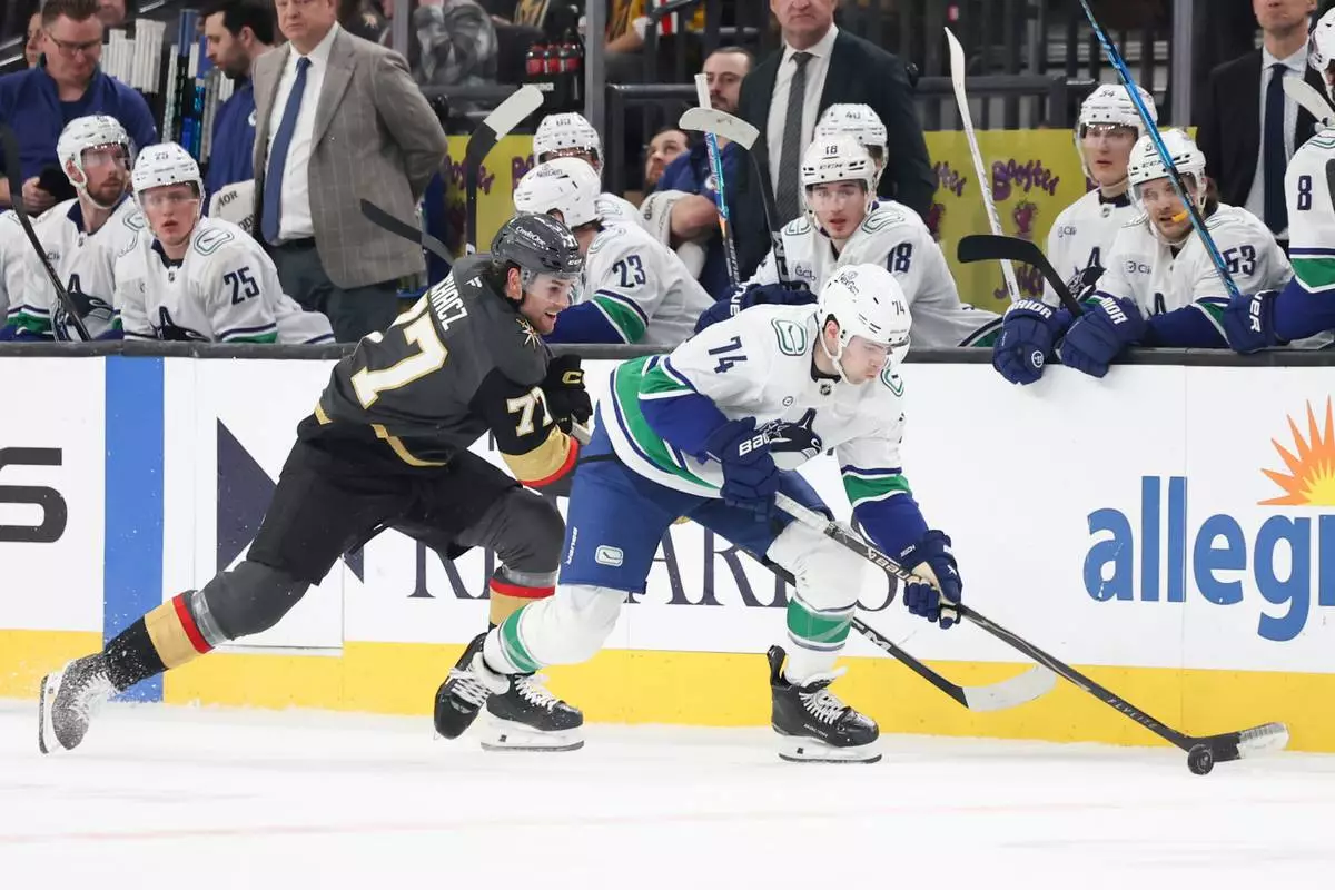 Vancouver Canucks left wing Jake DeBrusk (74) skates against Vegas Golden Knights center Kai Uchacz (77) during the first period of an NHL hockey game Wednesday, Feb. 4, 2026, in Las Vegas. (AP Photo/Ian Maule)