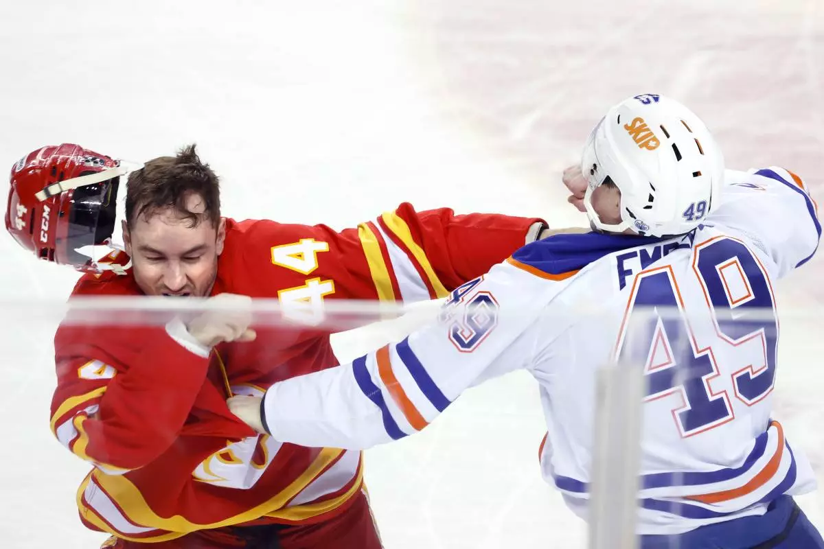 Edmonton Oilers' Ty Emberson, right, fights Calgary Flames' Joel Hanley during the second period of an NHL hockey game in Calgary, Alberta Wednesday, Feb. 4, 2026. (Larry MacDougal/The Canadian Press via AP)