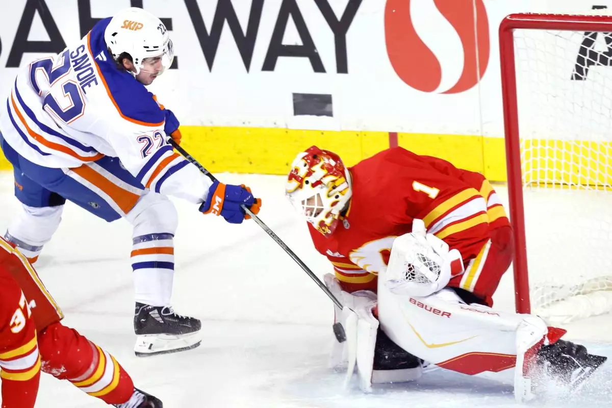 Edmonton Oilers' Matt Savoie, left, is stopped by Calgary Flames goalie Devin Cooley during third period NHL hockey action in Calgary, Alberta, Wednesday, Feb. 4, 2026. (Larry MacDougal/The Canadian Press via AP)