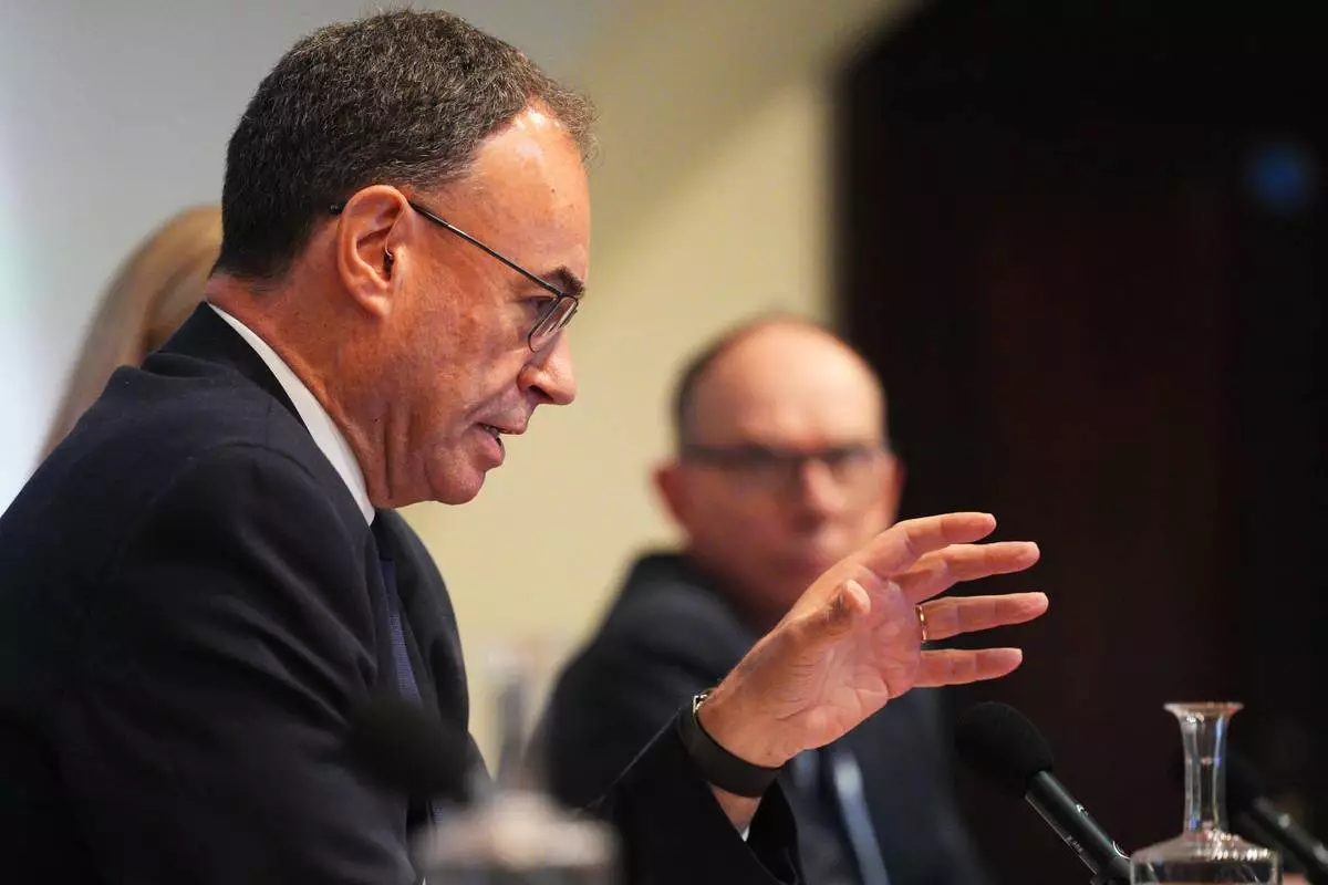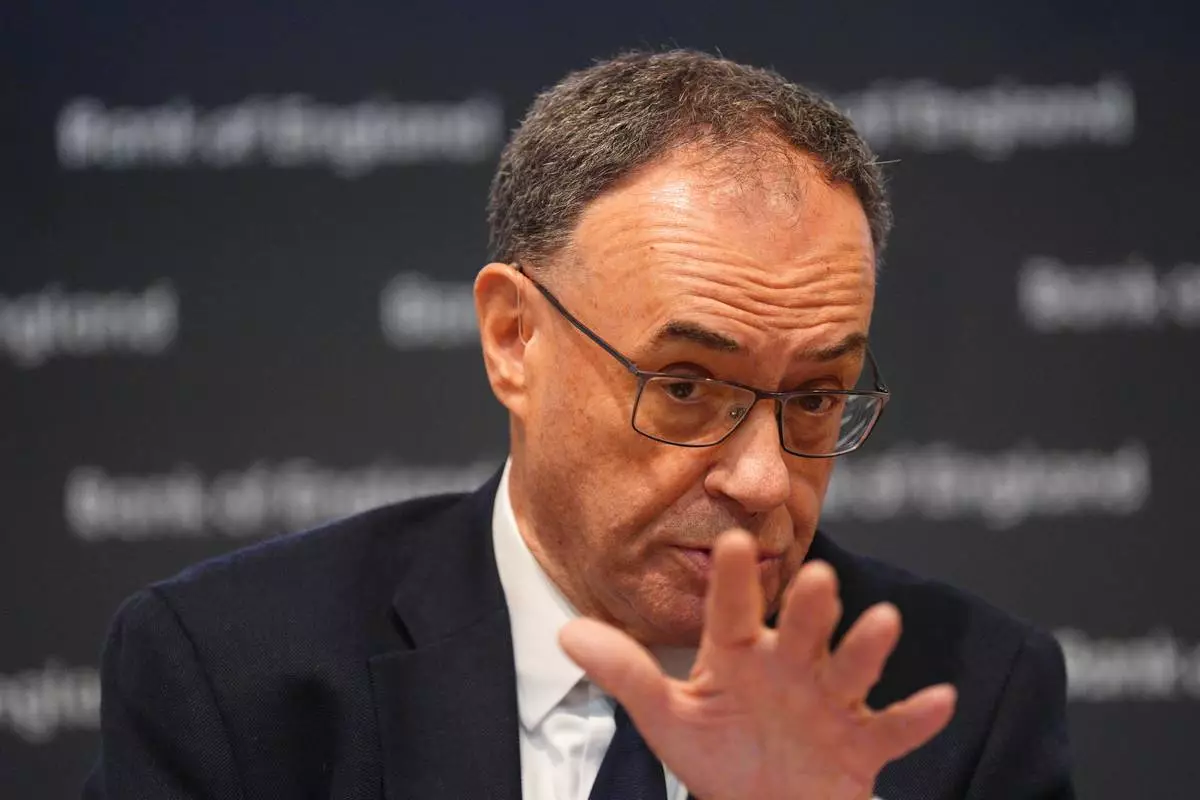 Governor of the Bank of England, Andrew Bailey, talks during a Bank of England Monetary Policy Report press conference in London, Thursday, Feb. 5, 2026. (Carl Court/Pool Photo via AP)