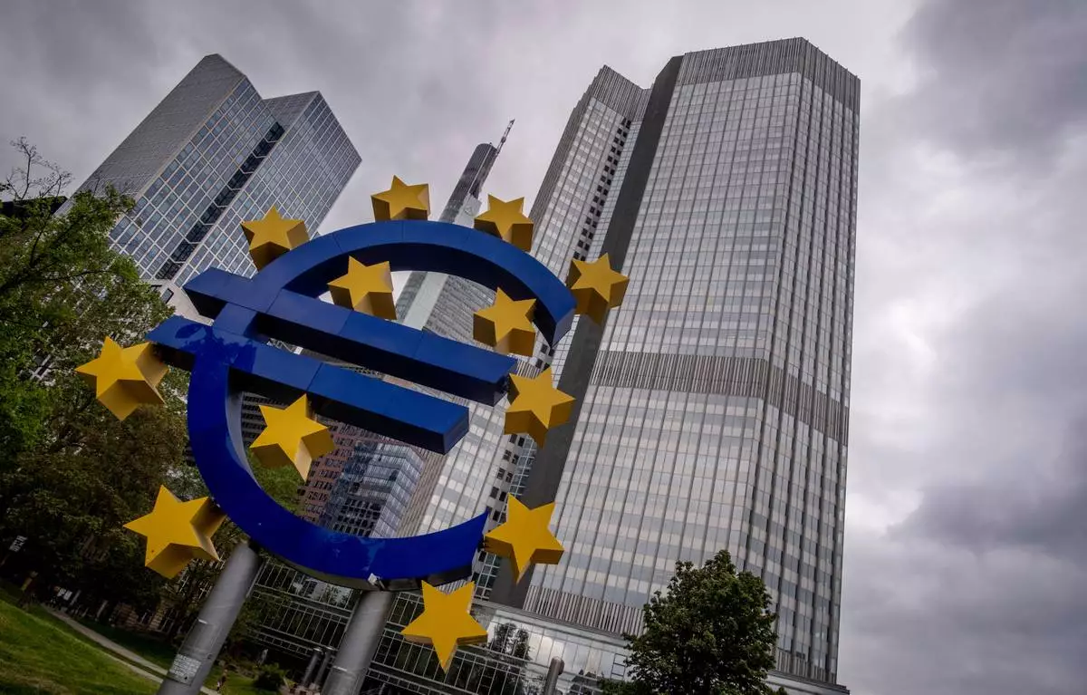 FILE - The Euro sculpture stands in front of the former headquarters of the European Central Bank (ECB) in Frankfurt, Germany, Tuesday, May 23, 2023. (AP Photo/Michael Probst, File)