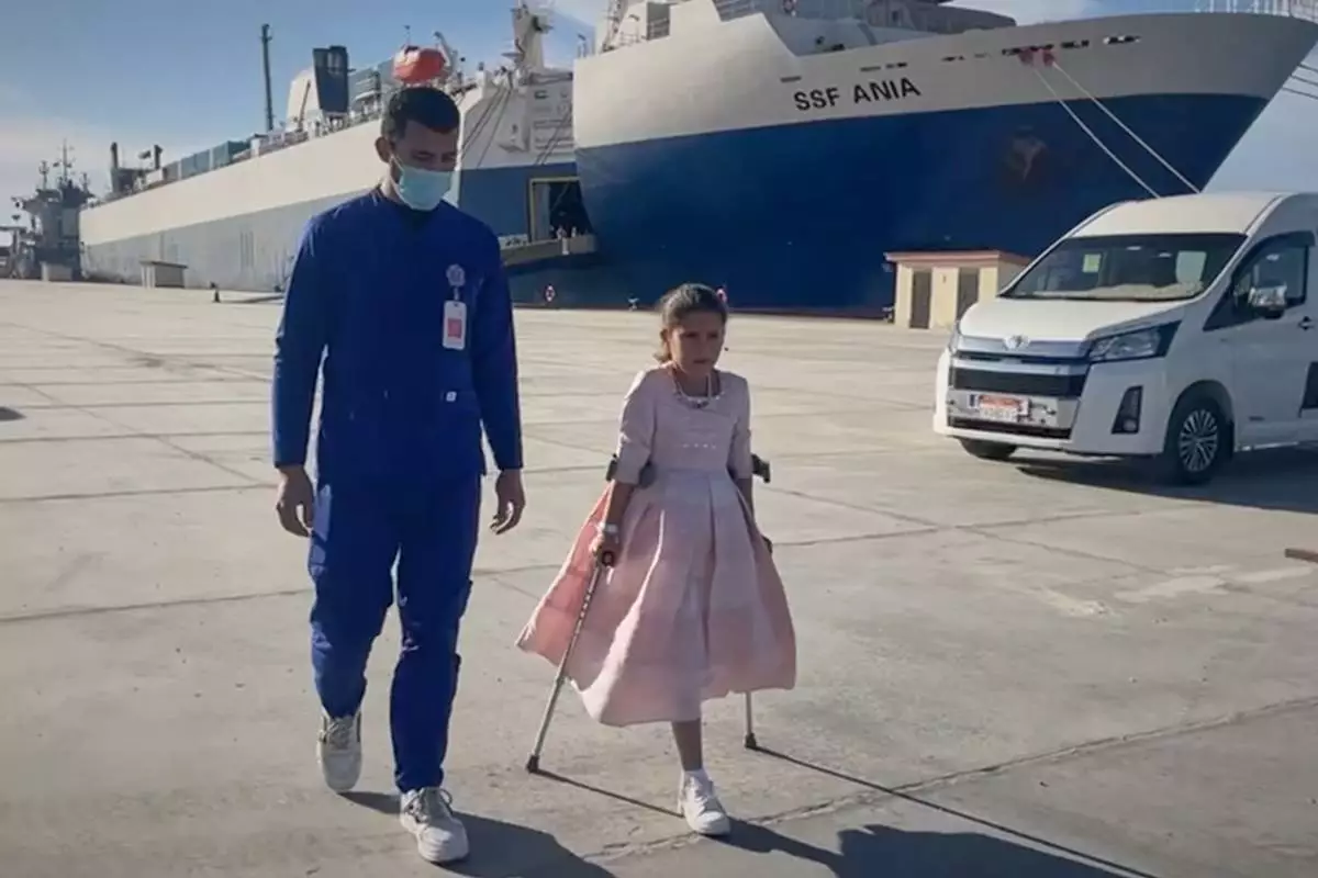 This frame grab from video shows injured Palestinian girl Maha Rafat, 10, from Gaza, as she walks after being evacuated from the Gaza Strip outside the UAE Floating Hospital in Al-Arish, Egypt, Thursday, Feb. 5, 2026. (AP Photo/Mohammed Arafat)