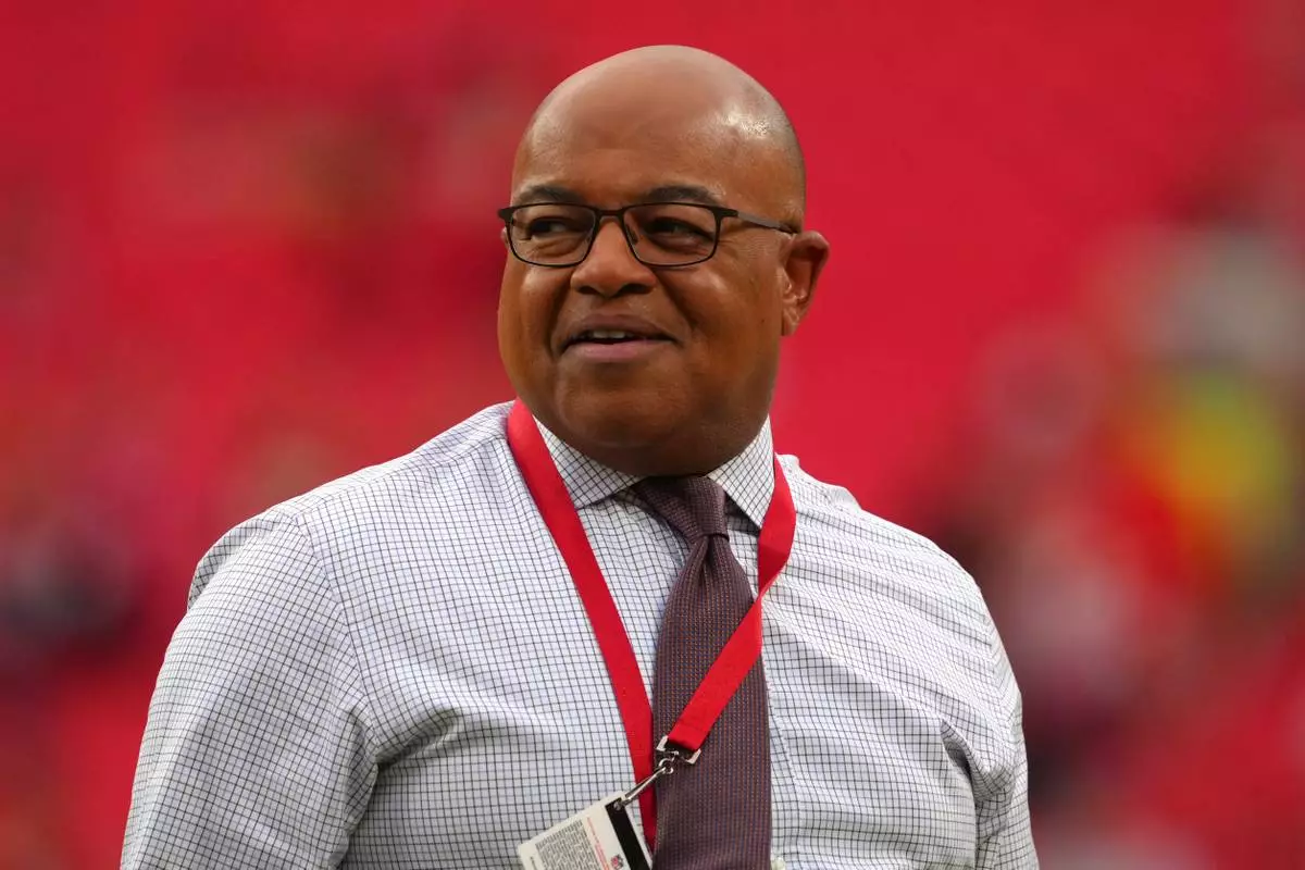 FILE - Sportscaster Mike Tirico is seen during an NFL football game, Oct. 12, 2025, in Kansas City, Mo. (AP Photo/Ed Zurga, File)