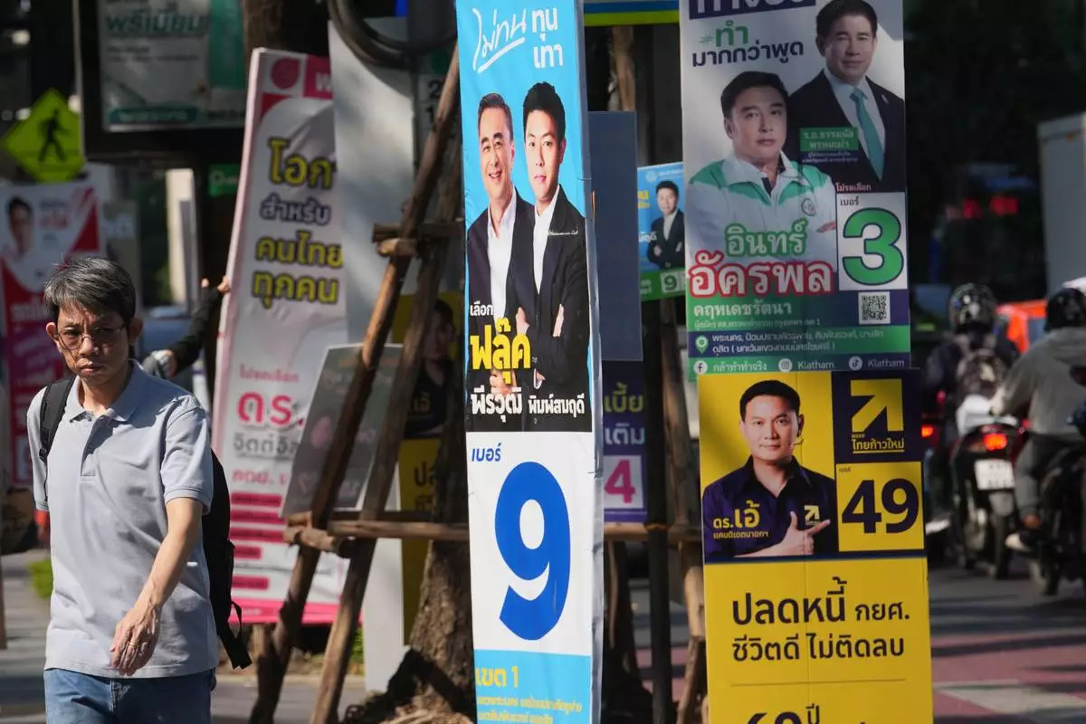 A man walks behind political parties' election campaign posters in Bangkok, Thailand, on Feb. 4, 2026. (AP Photo/Sakchai Lalit)