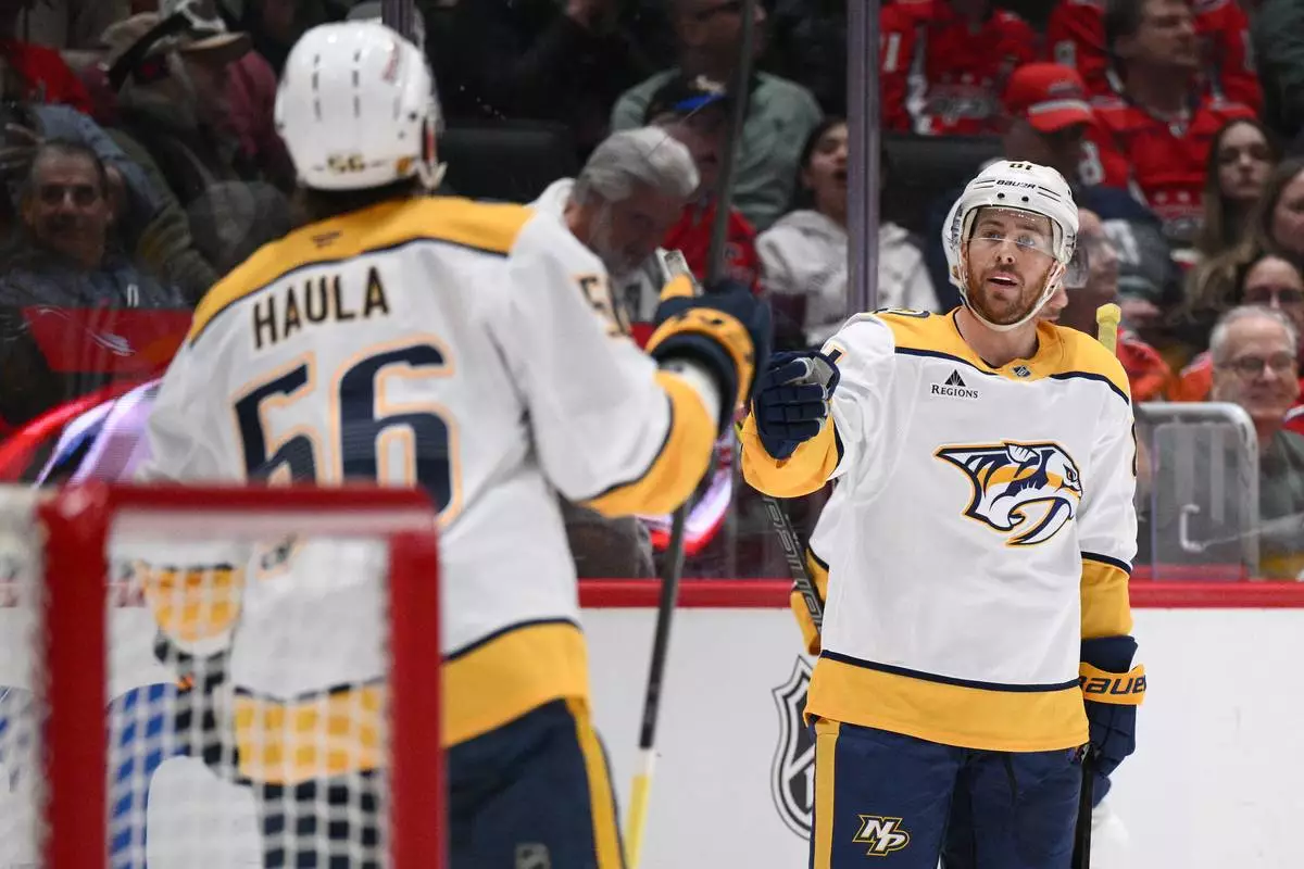Nashville Predators center Jonathan Marchessault, right, celebrates his goal with left wing Erik Haula (56) during the second period of an NHL hockey game, Thursday, Feb. 5, 2026, in Washington. (AP Photo/Nick Wass)