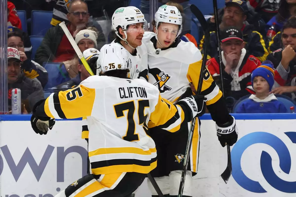 Pittsburgh Penguins center Ben Kindel (81) ,right, celebrates his goal with center Connor Dewar (19) ,center, and defenseman Connor Clifton (75) ,left, during the second period of an NHL hockey game against the Buffalo Sabres Thursday, Feb. 5, 2026, in Buffalo, N.Y. (AP Photo/Jeffrey T. Barnes)