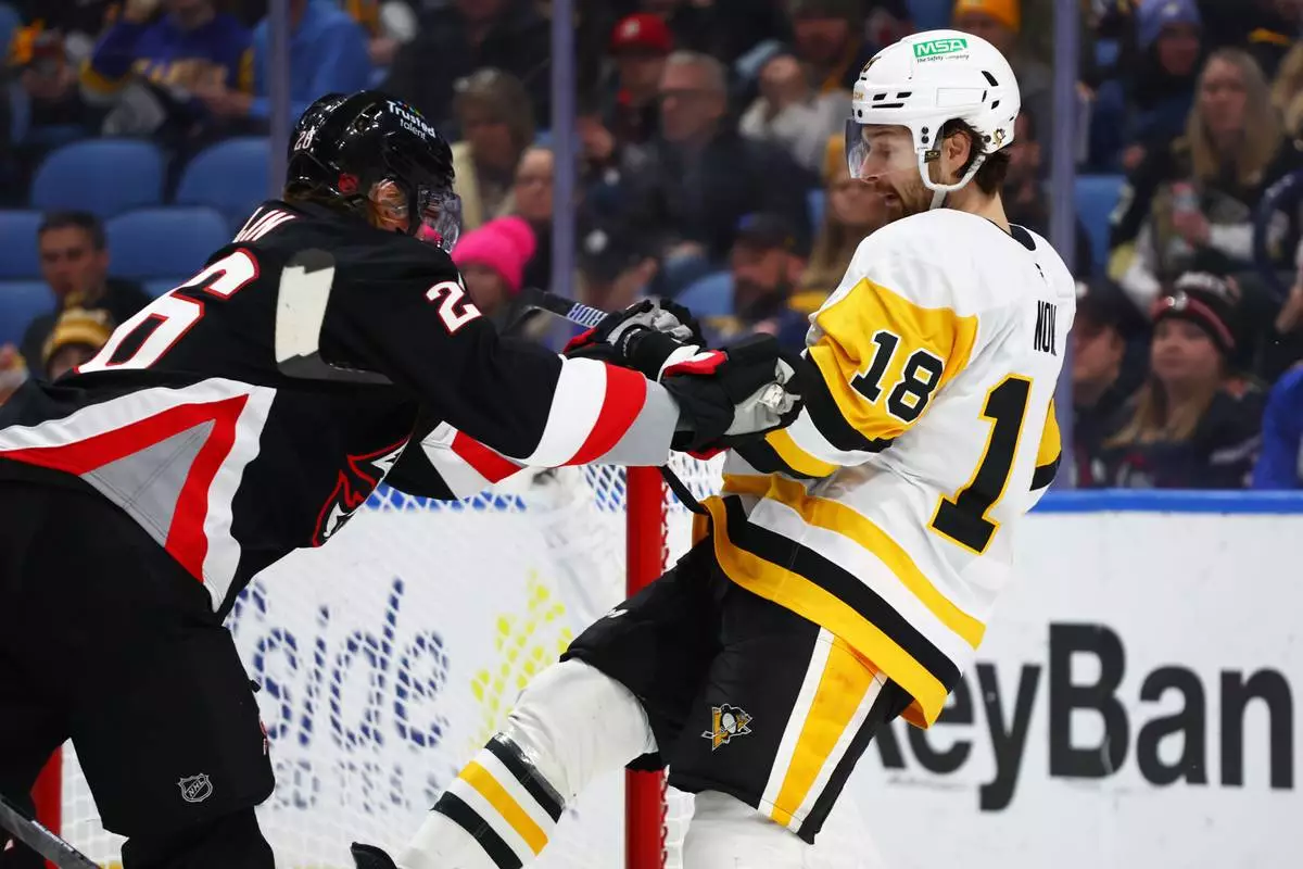 Pittsburgh Penguins center Tommy Novak (18) is stick checked by Buffalo Sabres defenseman Rasmus Dahlin during the second period of an NHL hockey game, Thursday, Feb. 5, 2026, in Buffalo, N.Y. (AP Photo/Jeffrey T. Barnes)