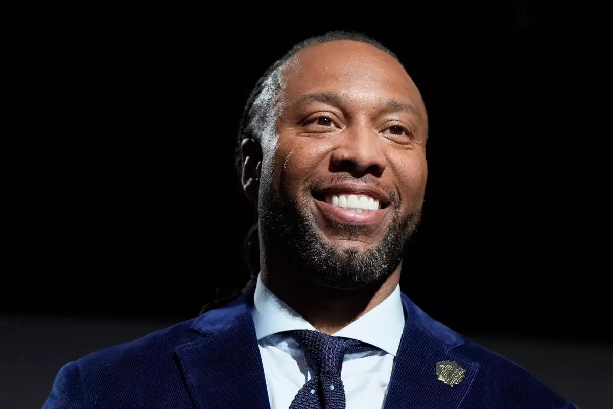 Larry Fitzgerald smiles after being announced for the Pro Football Hall of Fame class of 2026 during football's NFL Honors award show in San Francisco, Thursday, Feb. 5, 2026. (AP Photo/Brynn Anderson)