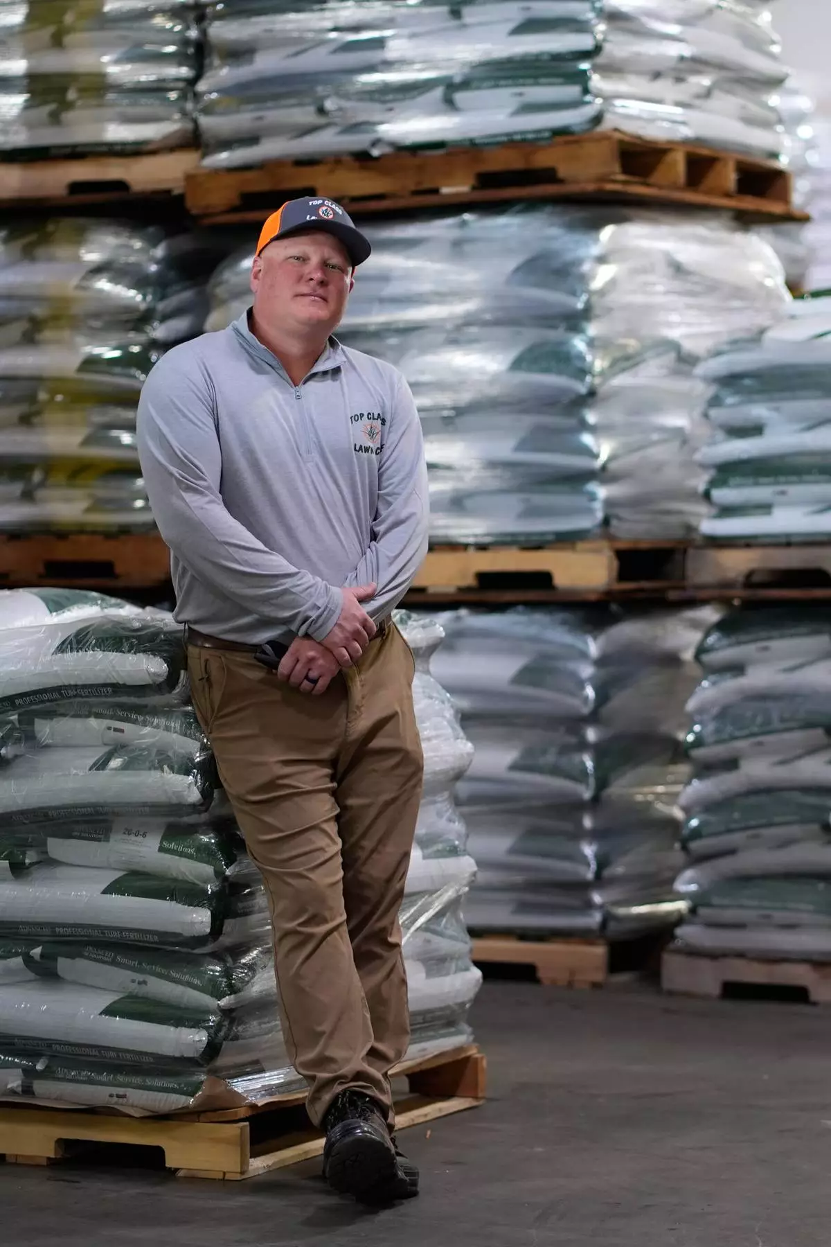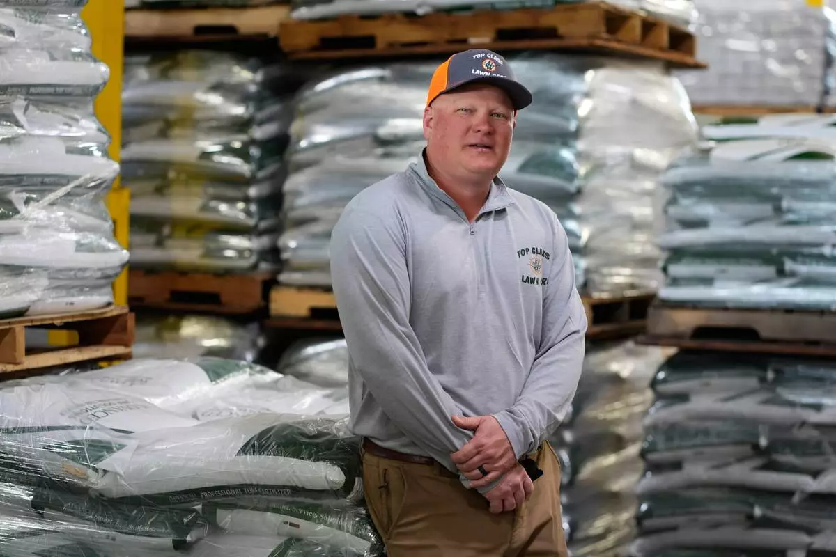 Top Class Lawn Care owner Jake Wilson stands by fertilizer he stockpiled at his supplier's warehouse in anticipation of Iran war related price hikes Thursday, March 26, 2026, in Riverside, Mo. (AP Photo/Charlie Riedel)