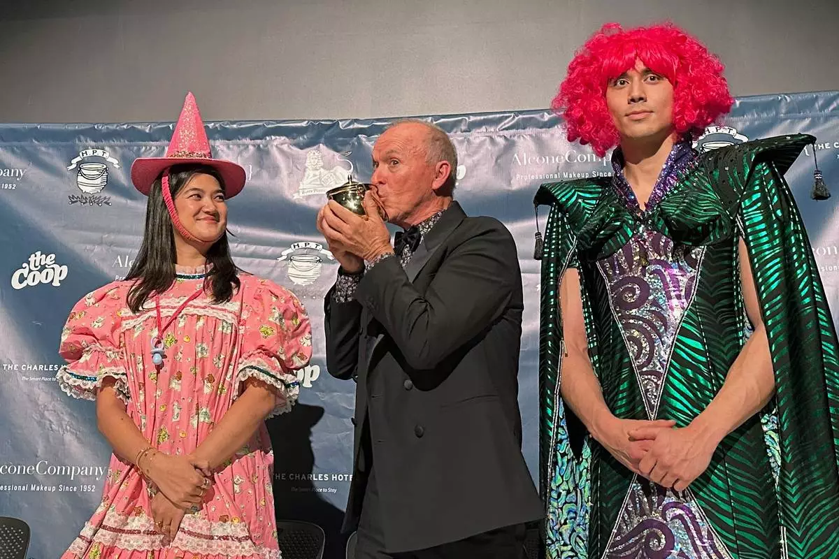 Actor Michael Keaton holds up his Pudding Pot that he received after being named 2026 Man of the Year from Harvard University's Hasty Pudding Theatricals at Harvard University in Cambridge, Mass., Friday, Feb. 6, 2026. (AP Photo/Michael Casey)
